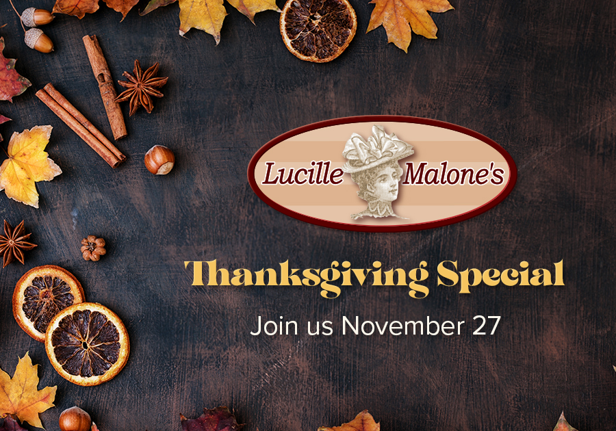 November 27th, please join us in Lucille Malone’s for a delicious traditional Turkey Dinner $18.99